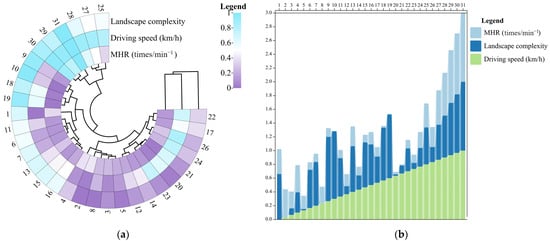 There are two types of fatigue: active and passive [73]. Active fatigue arises from factors such as a lack of subjective engagement, monotonous external environments, or a dearth of stimulation. Prolonged or intense stress responses are the root causes of active fatigue. Under active fatigue, sympathetic nervous system tension increases, leading to an increase in MHR. Driving fatigue falls under the category of active fatigue because it is triggered by driving demands. According to the experimental data from the 31 driver groups (Figure 11), when the vehicle was traveling at speeds of 60–64 km/h, the road landscape complexity was concentrated between 1.000 and 2.000. During this stage, the overall values of the average heart rate were relatively high and stable, indicating that the barren and unchanging landscape did not have a significant positive effect on alleviating driver fatigue. However, when the driving speed was in the range of 65–83 km/h, the landscape elements became more varied, and the complexity distribution ranged from 1.298 to 8.307. The MHR values fluctuated between 91.760 and 98.560, suggesting that as the road landscape gradually became richer and more visible, the average heart rate values underwent significant changes and showed a sustained decrease in overall levels. This indicates that road landscape complexity has a positive effect on alleviating driver fatigue. Overall, as the driving speed increased and the landscape complexity fluctuated, fatigue was alleviated, leading to a downward trend in the driver’s MHR.