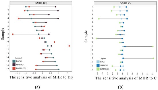 Figure 12. Sensitive analysis. (a) E(MHR, DS); (b) E(MHR, C). Abbreviations: E, sensitivity coefficient; MHR, mean heart rate; DS, driving speed; C, complexity.