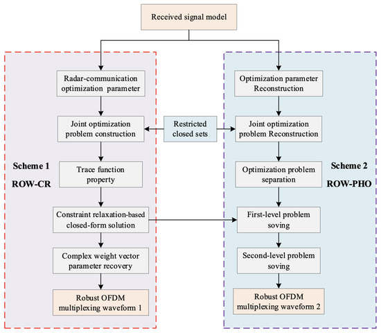 In this section, two OFDM multiplexing waveform design schemes under the proposed integrated system platform are explored, and the implementation flow is shown in Figure 2. For Scheme 1, we propose a robust OFDM multiplexing waveform design method based on constraint relaxation (ROW-CR). According to the restricted closed model and optimization parameters, the joint waveform optimization problem is constructed and its closed-form solution is realized by combining the properties of the trace function and partial constraint relaxation. Finally, the radar and communication weight parameters are restored. For Scheme 2, we first reconstruct the joint optimization problem and then propose a robust OFDM waveform design method based on parameter hierarchical optimization (ROW-PHO), which greatly reduces the computational complexity with a lower performance loss.