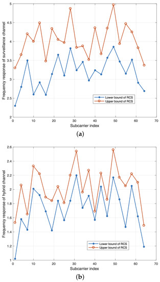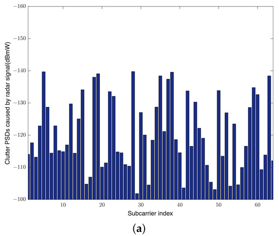 where , and , respectively, represent an vector composed of the , and of all subcarriers, represents a diagonal matrix, ⊙ represents the Hadamard product, represents a vector composed of the power spectral density of and represents a vector consisting of the propagation losses of surveillance channels corresponding to all subcarriers [40]. Then, the propagation loss of the surveillance channel corresponding to the mth subcarrier can be expressed as