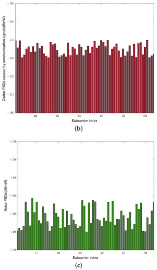 Power spectral density corresponding to different subcarriers. (a) Clutter caused by radar signals. (b) Clutter caused by communication signals. (c) Additive white Gaussian noise.