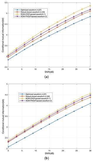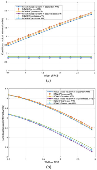 In addition, in order to further determine the influence of the width of RCS on the conditional mutual information, the variation in conditional mutual information of different waveforms with the width of RCS is depicted in Figure 6. Figure 6a,b shows the results obtained by adjusting the set width under the condition that the lower bound and the upper bound are fixed, respectively. It can be seen from Figure 6a that the conditional mutual information of all waveforms in the worst-case AFR does not change with the width of RCS, because the worst-case AFR is equal to a fixed value. When the actual frequency response is randomly selected, the performance of all waveforms increases with the increase in the width of the RCS, but the proposed ROW-CR is slightly better than the other two schemes. It can be observed from Figure 6b that the performance of all waveforms deteriorates with the increase in the width of the RCS, since with the increase in the width of the RCS, the value of the actual frequency response gradually approaches the worst-case AFR. In this case, the proposed ROW-CR also has better performance. As expected, the worst-case radar performance is greatly improved by the proposed schemes.