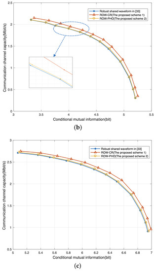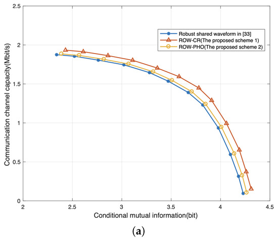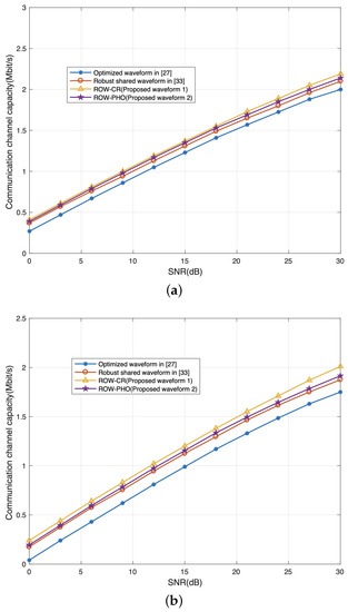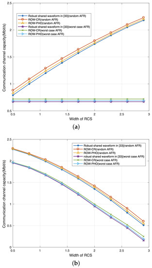 Figure 8 shows the dependence of the communication channel capacity on the width of RCS, which is consistent with the fixed upper and lower bound parameters in Figure 6. As can be seen from Figure 8a, since the fixed parameters and the worst-case AFR are corresponding, with the increase in the set width, the communication performance of all waveforms remains unchanged. On the contrary, Figure 8b fixes the parameters under the optimal system performance, which shows that with an increase in the width of RCS, the system gradually approaches the worst-case AFR, resulting in the gradual deterioration in communication performance. Overall, in both cases shown in Figure 8, the proposed schemes show better communication performance.
