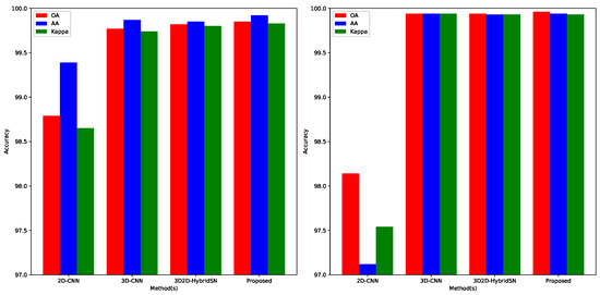 Furthermore, as shown in Figure 2, we conducted two sets of experiments on the SV dataset based on spatial size. Two abscissae and two ordinates, respectively, indicate the names of different methods and classification accuracies (in percentages). Under the condition using established methods, we compared the classification performance using two different spatial sizes ( and ) and 10% training samples. The left one represents the classification result using the spatial size . Correspondingly, the right one represents the classification result using the spatial size .