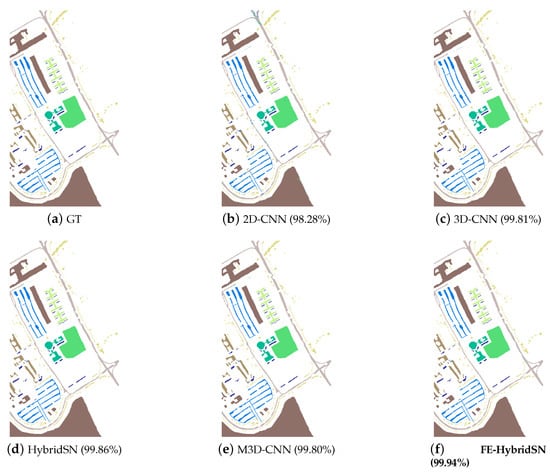 Classification maps for the UP dataset with 10% labeled training samples and spatial window. (a) Ground truth. (b) 2D-CNN [53]. (c) 3D-CNN [54]. (d) 3D2D-HybridSN [31]. (e) M3D-CNN [55]. (f) Proposed. In the subfigure (b–f), the right brackets encompass the overall classification accuracies, and the best classification result is highlighted in bold.