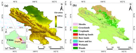 The study area encompasses Zhangye City and Haibei Tibetan Autonomous Prefecture, located in the middle reaches of the Heihe River Basin, with a total area of approximately 73,000 square kilometers. Zhangye City is in the middle section of the Hexi Corridor and is characterized by flat terrain dominated by cropland, grassland, bare soil, and wetland. The Haibei Tibetan Autonomous Prefecture is in the central part of the Qilian Mountains, with rugged terrain and elevations ranging from 2180 to 5287 m above sea level. Areas above 3000 m account for more than 85% of the total prefectural area and are mainly covered by cropland, grassland, and bare soil. Figure 1 shows the study area’s geographical location, elevation, and land cover.