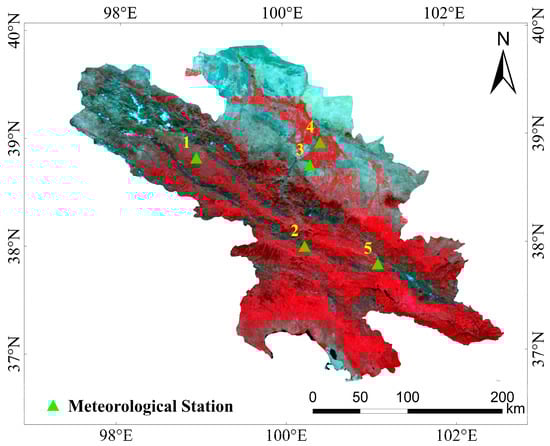 - The observed meteorological data used to verify the accuracy were obtained from the National Tibetan Plateau Science Data Center. Figure 2 shows the locations of the meteorological stations within the study area, and Table 2 provides information on the altitude and time range for each station. The observation dataset is the up-and-down longwave radiation recorded every 10 min by the meteorological stations []. The observed surface temperature was calculated as follows by applying the Stefan–Boltzmann law to the up-and-down longwave radiation and MODIS emissivity dataset:Figure 2. Location of meteorological stations within the study area. The map displays a standard pseudo-color image of the study area; detailed information on stations 1–5 is available in Table 2.Table 2. Information for each meteorological station.
