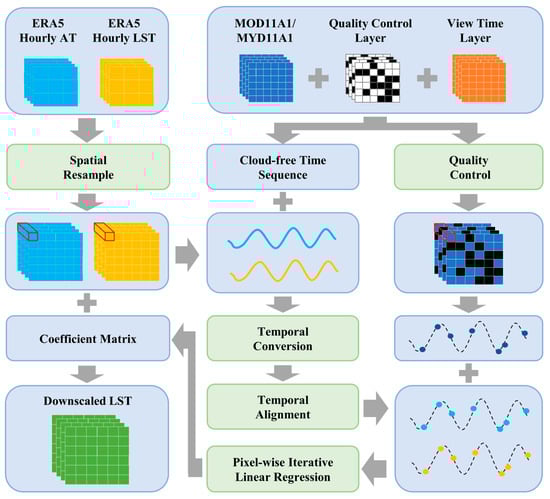 Given the discussion above, developing a method to downscale LST that is not limited by weather conditions and guarantees the spatial completeness and temporal continuity of the downscaled LST is an urgent problem that needs to be solved. The ERA5 reanalysis data from the European Centre for Medium-Range Weather Forecasts provides hourly LSTs with high temporal resolution, a long time span, and easy accessibility. Previous studies show that the ERA5 LST product correlates strongly with actual LSTs, although the error is non-zero. However, whether it can be downscaled spatially to increase the spatiotemporal resolution requires further research. The present study thus proposes a pixel-wise temporal alignment iterative linear regression model (PTAILRM) for downscaling the ERA5 LST product based on the MODIS LST product and air temperature factors. The method involves time matching and iterative linear regression of each pixel, downscaling the continuously time-resolved, coarse-resolution ERA5 LST to a fine resolution and temporally sampling it to local time at whole-hour intervals. In this study, the ERA5 LST in the study area was downscaled to a resolution of 1000 m using the proposed method. The downscaling results of land-cover data and other representative methods were employed for qualitative evaluation, while the site-measured data were used for quantitative evaluation.