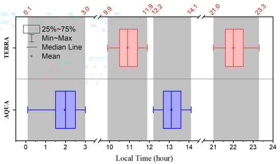 MODIS view time for 2012–2021. The gray area in the figure represents the local time interval of MODIS transit.