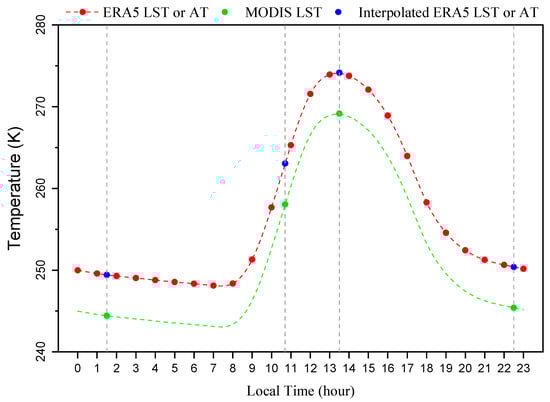 To address the problem of inconsistent sampling times between the ERA5 and MODIS LSTs, the high and continuous temporal resolution of the ERA5 product is used in combination with the view time data layer of the MODIS product to perform a cubic spline interpolation on a pixel-by-pixel basis. This temporally aligns the two products in the time domain (as illustrated in Figure 5).
