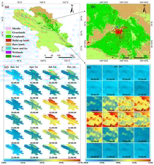Spatial representation of downscaled LST. Shown in (c) are the downscaled LSTs for the first day of January, April, July, and October, representing each season in 2021. The results are displayed at 4 h intervals. The geographical location of Zhangye urban area, land-cover type and hourly LST after downscaling on 1 July 2021 are presented in (a,b,d), respectively, to better present details.