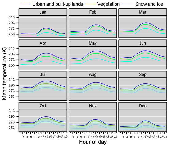 This study uses a monthly average method to calculate and represent the hourly diurnal variations of the downscaled LST for three distinctive surface-cover types: urban regions, vegetation, and ice- and snow-covered landscapes (see Figure 7). Correspondingly, their deviations from daily mean temperatures and daily maximum temperatures are tabulated to facilitate a comprehensive analysis and evaluation (see Figure 8).