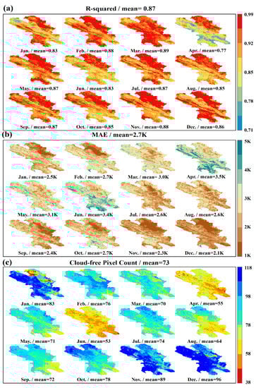 Spatial distribution of R2, MAE, and averaged CPC for each month between 2012 and 2021. (a–c) show the spatial distribution of R2, MAE and CPC in the study time range respectively by month. The total and monthly mean values of these indicators are given in text in the figure.