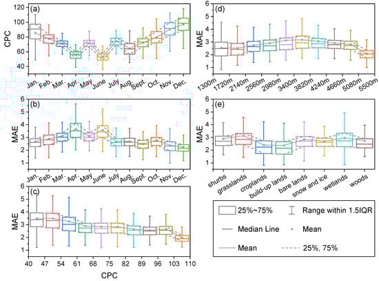 Figure 11d,e show the statistical fluctuation of the MAE with respect to the elevation and land-cover type. The shape and pattern of the box plot indicate that the MAE varies less in terms of the elevation and land-cover type when compared to the CPC. In Figure 11d, the MAE distribution has high values in the middle elevations (around 4000 m) and low values at extreme elevations. In Figure 11d, the overall MAE for cropland and urban areas is relatively low, whereas for the grassland and wetland, it is relatively high compared with other land-cover types.