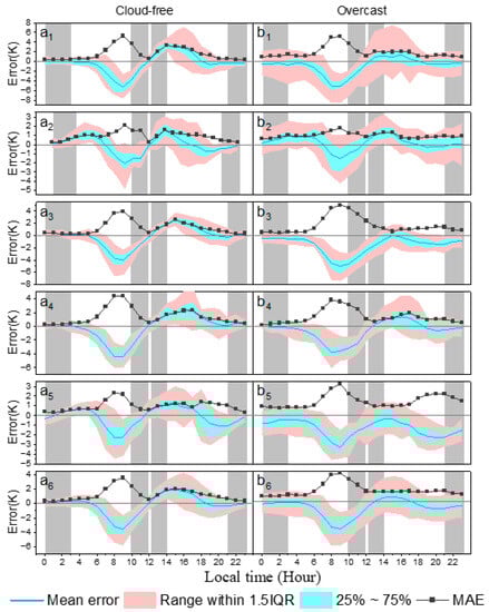 Error, ME, and MAE statistical distributions on an hourly scale from 2012 to 2021. The gray areas represent the sampling periods for the input data used in the regression, which correspond to the overpass times of MODIS. In addition, (a1–a5) and (b1–b5) correspond to clear and non-clear sky periods for the five meteorological stations, respectively, while (a6,b6) show the mean statistical distribution of various indicators for the five meteorological stations under cloud-free and overcast conditions, respectively.