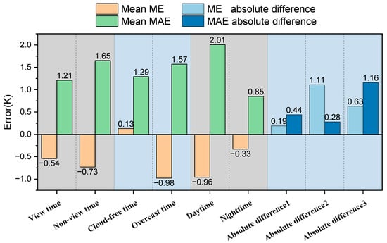 ME and MAE for each time period from 2012 to 2021. The absolute differences between the ME and MAE values for view time versus non-view time, cloud-free time versus overcast time, and daytime versus nighttime are 1, 2, and 3, respectively.