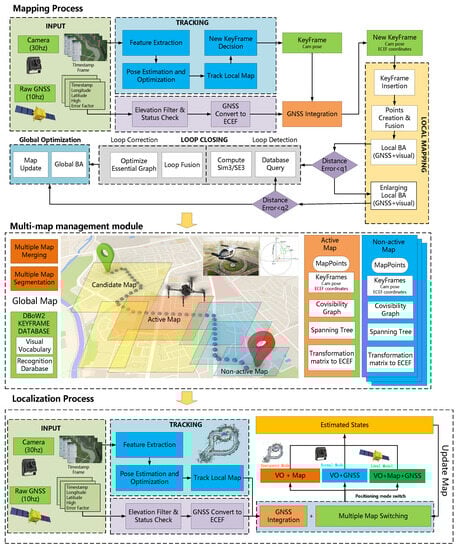 The proposed system employs a feature-based visual SLAM algorithm and incorporates GNSS data as an offline tool to create a comprehensive multi-map. The system can operate in either purely visual or visual GNSS mode, enabled by using a monocular camera capable of both pinhole and fisheye configurations. The overall framework of the system is shown in Figure 1.
