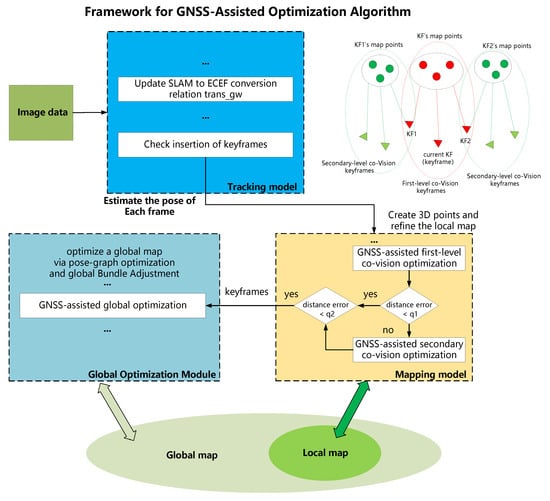 (3) Local mapping thread: This system optimizes the active map by incorporating newly acquired keyframes and map points while removing excess ones. It utilizes visual and GNSS data to minimize reprojection errors and GNSS range errors as residual terms. Furthermore, based on the GNSS range error threshold of the current frame, a multi-level optimization strategy is implemented by leveraging co-visual keyframes at multiple levels. The term “co-visual keyframes” refers to keyframes that observe common map points.