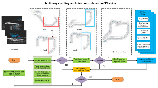 - To address the issue of excessive discrete maps leading to resource wastage and reduced map-switching efficiency, we propose a multi-map-matching and fusion algorithm based on geographical location and visual information. Unlike the standard bag-of-words model, we employ GNSS assistance to detect overlapping areas, accelerating detection speed and reducing false matches from similar scenes. By performing map fusion, the integrity of the SLAM operation area is maximized, and the system’s robustness in long-distance visual navigation is enhanced.