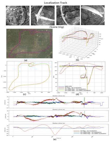 The analysis of the three modules above demonstrates that the multi-sensor fusion-based localization method significantly enhances the robot’s positioning accuracy. The camera and IMU work in local coordinate systems for outdoor large-scale navigation and localization, so it is ideal for fusing GNSS global information to reduce cumulative errors. Existing GNSS-assisted methods can work during intermittent GNSS signal losses. However, in cases of complete GNSS signal loss, they degrade to a purely local sensor positioning mode, inevitably leading to cumulative errors. Furthermore, these approaches predominantly emphasize real-time state estimation, with less emphasis on multi-map construction. UAVs and eVTOL must have alternative solutions to continue providing global positioning information in the event of GNSS signal loss. Considering that the cameras and IMU (inertial measurement unit) operate in local coordinate systems, there are several issues to address in UAV flight, such as significant disturbances on the IMU caused by high-frequency vibrations. Moreover, extensive research has been conducted on integrating cameras and IMU for navigation. Existing GNSS-assisted methods can work during intermittent GNSS signal losses. However, in cases of complete GNSS signal loss, they degrade to a purely local sensor positioning mode, inevitably leading to cumulative errors. Among the numerous methods available, our primary focus lies in effectively integrating the complementary features of the global positioning sensor GNSS, the local positioning sensor from the camera, and the high-precision multi-map data. We aim to explore how these components can be combined to enhance navigation accuracy. Furthermore, our approach is designed to be extendable to incorporate other methods in the future. Hence, our system proposes a health-based SLAM multi-map construction method. Under normal circumstances, we utilize GNSS assistance to optimize and establish high-precision maps. When GNSS signals are disrupted or lost in emergency scenarios, our proposed multi-map-based visual SLAM online localization method comes into play. This method allows us to select suitable maps to continuously provide global positioning information for UAVs and eVTOL, providing an additional assurance layer.