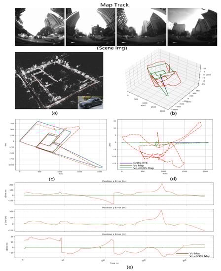 However, these systems also face numerous challenges. Firstly, the positions and orientations generated by cameras and IMUs are in a local coordinate system and cannot be directly used for global localization and navigation. Secondly, odometry drift is inevitable for any visual-inertial navigation system without the constraint of global positioning information. Although loop closure detection and relocalization algorithms have been implemented to reduce the accumulation of relative errors [6,10], these methods have significant drawbacks in long-distance autonomous driving scenarios, including increased computational complexity and memory requirements. Our experiments indicate that existing SLAM techniques are unsuitable for long-distance visual navigation beyond several tens of kilometers, as they exhibit average root mean square errors as large as several tens of meters. Finally, the majority of visual-inertial navigation systems (VINS) are vision-centric or vision-dominant, and they do not fully consider the precision of the inertial navigation system (INS). Low-cost inertial navigation systems (INS) based on MEMS (microelectromechanical systems) technology cannot provide high-precision positioning for extended periods beyond 1 min. As sensors for local navigation, their long-term accuracy is insufficient, leading to significant issues with accumulated errors. Each time an inertial navigation system starts operating, it requires time calibration. If this calibration step introduces significant errors, it can lead to substantial issues with the integration process. Furthermore, in these systems, the information from low-cost inertial navigation systems has minimal contribution to the visual process, which can potentially reduce the robustness and accuracy of the system in optically degraded environments. In large-scale applications requiring precise global localization, VIO faces limitations when used without expensive pre-built maps or assistance from global localization information. This constraint limits the VINS (visual-inertial navigation system) to operate only within small-scale scenarios.