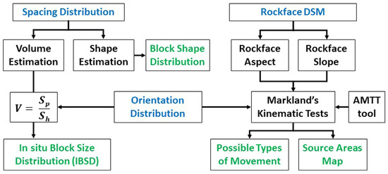 Photogrammetry also plays an important role in matters such as landslide investigation and monitoring or hazard mapping. UAV-based techniques provide a cheap and high-resolution solution for the definition of the morphological parameters describing a slope [14] but also give important information required to define the numerical models, both 2D and 3D, commonly employed to quantify and then map the hazard produced by phenomena such as rockfall and then develop a proper mitigation approach [15,16,17]. In this regard, it is worth mentioning the fact that non-contact techniques for rock mass surveys have proven even more useful due to the high quantity of quality data they can provide, allowing for proper statistical treatment [18] and the use of probabilistic approaches. Among others, one with significant potential involves the definition of an In Situ Block Size Distribution (IBSD) [19,20,21,22]. This method employs a probability distribution to describe the possible values of block volume within a given rock mass as a function of the orientation and spacing distributions of its discontinuities: i.e., a proper description of its geometrical features, accounting also for the natural variation in these parameters. A proper, complete and statistically reliable description of block volume or size is a key step in the definition of the parameters describing the mechanical problem presented by rockfall processes: these are usually accounted for, especially when dealing with protective works, in terms of total kinetic energy, which is a function of the block velocity and its mass. The mass is, in return, a function of block volume and rock density.