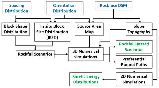 It is worth noting that the common denominator in all three phases is the underlying probabilistic methodology. This is highly important: as pointed out by Bourrer et al. [31], among others, the deterministic description of processes such as rockfall tends to highly oversimplify the problem due to the impossibility of properly describing every variable involved realistically, be it the topography of the slope, the rock mass features or the shape of blocks. Therefore, a probabilistic approach is strongly advised and feasible, considering how fast and simple it is to obtain through non-contact methods large quantities of high-quality raw data to be used for rock mass characterization.
