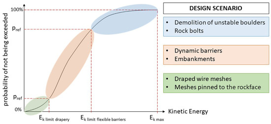 From the output of the 2D numerical simulations, a so-called Design Scenario can be defined; such a scenario can be visually described in terms of the energy of the phenomenon by a curve: the probability distribution of kinetic energy can be divided into portions, each of which identifies the range of effectiveness of a given passive or active countermeasure. In fact, the choice of a countermeasure directly depends on the energy involved in a given phenomenon, as that is the energy level it will be required to withstand; moreover, in the case of passive defensive works (i.e., embankments, flexible barriers), the structure has to be tall enough to capture the falling blocks. This means that the structure will have to be at least as high as the bounces those blocks produce along their path downslope. A probabilistic approach has the advantage of associating to each value a probability of not being exceeded, easily providing a well-structured and reliable method that avoids empirical choices of deterministic values but provides the full spectrum of possibilities. An example of a curve of the kind just described, named Design Scenario Curve (DSC), is visible in Figure 5. The curve is intended to be used in a twofold way: the first one consists of selecting a reference probability of not being exceeded on the vertical axis, intercepting the curve and identifying on the horizontal axis the correspondent parameter value (i.e., the kinetic energy in the figure). The second way, conversely, consists of entering a given parameter value on the horizontal axis (i.e., the kinetic energy, in the figure), intercepting the curve and quantifying the corresponding probability of not being exceeded. In the schematic diagram of Figure 5, we can see that two energy values are identified on the curve, corresponding to the maximum energy levels manageable by two types of mitigation techniques (active and passive): the Design Scenario allows one to visualize the effectiveness of a technique, based upon the extent of the portion of the DSC curve corresponding to energy values lower than the maximum service level of the technique. Everything above that level will require a different approach.