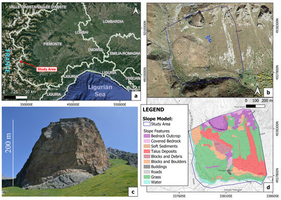 (a) Location of the study area in the Western Italian Alps, (b) an aerial and (c) frontal view of the location and (d) the model of the slope features employed in the 3D simulations.
