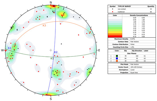 The image sequences obtained from the UAV flights were aligned by means of Agisoft Metashape, and the DSM of the rockface was obtained. The overall rockface area covered by the DSM is about 60,000 m2, and its average resolution is 40 points/m. The non-contact survey of discontinuity geometrical features (traces and planes) was performed on the DSM by means of the Rockscan code [45]. To validate these results, a series of traditional surveys was carried out on the rock mass itself. The discontinuities measured with both techniques are visible in the stereographic projection of Figure 7. Although with a certain variability, the studied rock mass features three main discontinuity sets (Table 1); among these, the one identified as K3 represents the main metamorphic foliation of the quartzite of the rock massif.