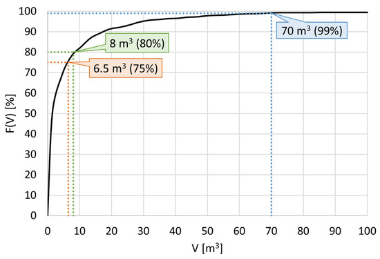 IBSD of the studied rock mass with the volumes corresponding to 75%, 80% and 99% cumulative frequency F(V).