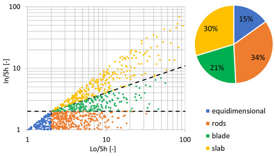 where SO indicates the global output of a given scenario, POe, POr, POs and POb represent the partial output for the equidimensional, rod-like, slab-like and blade-like shape, respectively, and e, r, s and b describe the relative abundance of the equidimensional, rod-like, slab-like and blade-like shape. This process needs to be replicated for every simulated volume derived from the IBSD. In fact, the approach just described can be applied only to the shape distribution, as it describes the relative abundance of the four different shapes by means of absolute frequencies; the same cannot be accomplished for the different volumes described by the IBSD, where each volume value is correlated to its probability of not being exceeded or to its cumulative frequency. It must be stressed how the evaluation of the shape distribution and its subsequent implementation in the numerical simulations is a methodological novelty introduced in this work. Although many software that are able to handle shapes exist, the use of the actual distribution of shapes to enhance the quality and accuracy of the results, as presented here, cannot be found anywhere else, to the authors’ knowledge. A schematic workflow describing these steps of Phase 2 is presented in Figure 3.