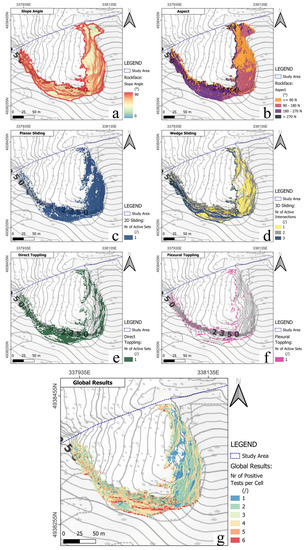 From top to bottom: (a) slope and (b) aspect of the studied rock mass; the outputs of the AMTT algorithm, defining where each type of movement is possible: (c) planar sliding, (d) wedge sliding, (e) direct toppling and (f) flexural toppling; (g) how many sets or intersections are active.