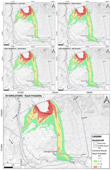 where Preach(x) is the reach probability of a given cell x, NB(x) is the number of blocks passing through the cell, Nsims is the number of simulations and Nsources(x) is the number of source cells from which a block reaches the considered cell. The map obtained in this manner describes the probability of a block reaching each cell of the analyzed area. By combining the contribution of each of the four shapes, as was carried out for each other output file of interest, it is possible to obtain a global map describing the tendency of falling blocks to reach each portion of the study area. By defining reasonable threshold values, it is possible to produce an easy-to-read map; in this study, the threshold values considered were: