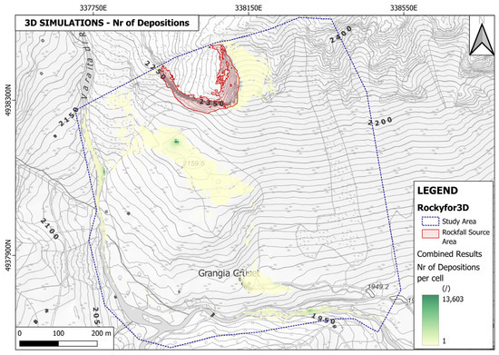 The Global Reach Probability map (Figure 11) allows the observer to appreciate two key features. First of all, the high (in red) and intermediate (in yellow) probability areas are very concentrated along the preferential run-out paths visible in Figure 12: this means that rockfall events show a significant tendency to follow those paths, only straying from them in very rare instances, a fact that is actually supported by the evidence of past recorded events and the arrangement of actual blocks found along the slope. Second, it appears that the buildings at Grangia Cruset are just outside a low-probability-of-being-reached area (in green in Figure 11). This suggests that what happened on 22 July 2017, when the 6 m3 block reached the buildings and than proceeded downslope towards the river, was a very unlikely event to occur, at least according to our models. It is important to know that the area outside the low-probability sectors in Figure 11 does have a very low Reach Probability, numbering between 0 and 1%.