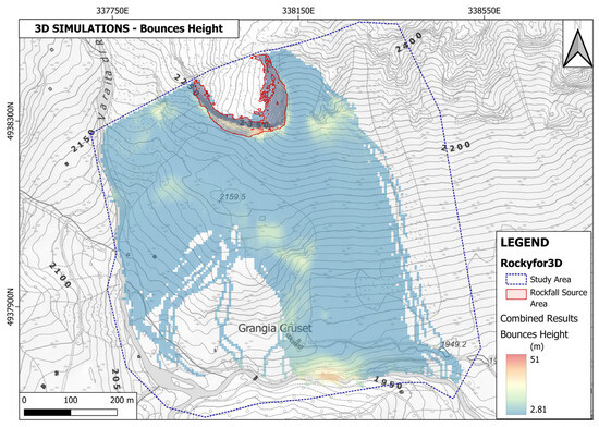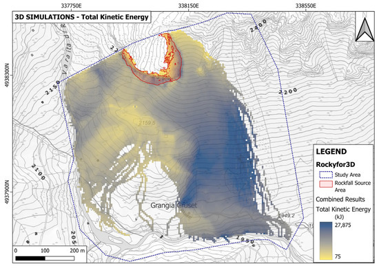 Four different simulations were performed to evaluate the contribution of every shape; each of these simulations accounted for 1.000 blocks falling from each source cell. Each of the outputs of the four simulations has been combined to obtain a global result. This is visible in Figure 11 for the Reach Probability map. Figure 12, Figure 13, Figure 14 and Figure 15 show the other output maps: the Number of Passages per cell, which highlights the preferential runout paths, the Number of Depositions per cell, which visualizes depositional areas, the Total Kinetic Energy and the Bounces Height. From the Number of Passages and Number of Depositions maps, it is clear that most of the blocks that fell from the studied rock mass are either stopped by the reliefs just upslope with respect to the buildings of Grangia Cruset or are channeled towards the wide slope to its east and then stop in the flat area next to the road. The distribution of the simulated depositions also maps quite precisely the real deposits, with large blocks and boulders mapped in the study area. Clearly, it is the east-facing side of the rock mass that is more likely to produce blocks that are able to reach the lowermost portion of the study area and the buildings located there. On the one hand, this is good: the exposed buildings are protected from the most cinematically active portion of the rock mass by the natural topographical features of the area. On the other hand, though, rockfall originating on the east-facing side of the rock mass has a significantly longer runout along a steep slope. This means that those blocks have a higher probability of reaching higher energy levels. This is corroborated by the Total Kinetic Energy map, where high energy values are mostly located in the lower half of the eastern slope, and by the Reach Probability map, where we see values above 1% in the lower sector of the study area only on the eastern slope.