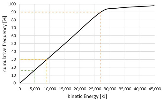 DSC for the Total Kinetic Energy: to achieve a protection efficiency of 90%, a protection work has to be able to withstand energies of at least 27,000 kJ (in red). A 5000 kJ (in green) or 10,000 kJ (in orange) flexible barrier would not be particularly efficient.
