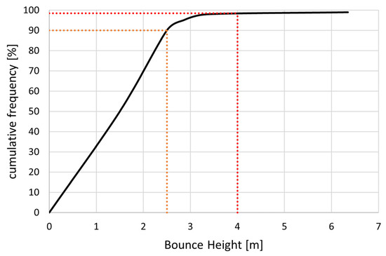 DSC for the Bounces Height: to achieve a protection efficiency of 90%, a protection work has to be at least 2.5 m high (in orange). A 4 m high rockfall flexible barrier (in red) would be even more efficient.
