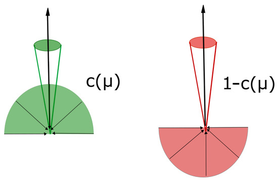 The angular back-scattering and forward scattering coefficients (red) and (green). The semicircle indicates the hemispheric radiation scattered in the direction by the layer. In the figure .