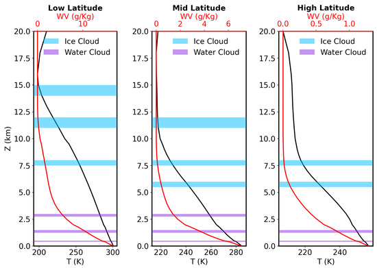 Temperature (black solid line) and water vapor mixing ratio (red line) vertical profiles for three different scenarios. Light blue and purple shaded bands indicate the height position and thickness of the ice and liquid water clouds, respectively, used in the computations.