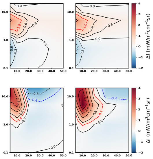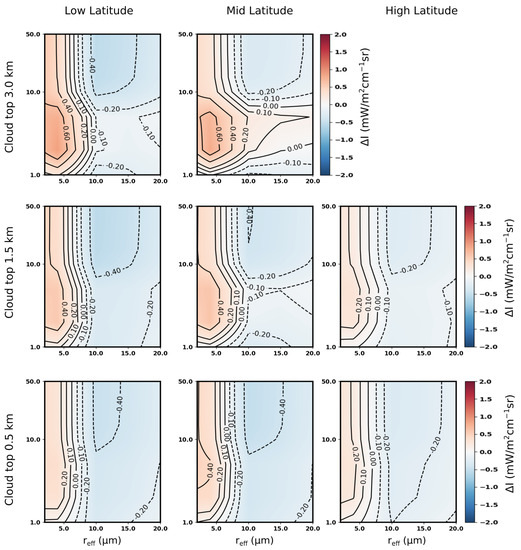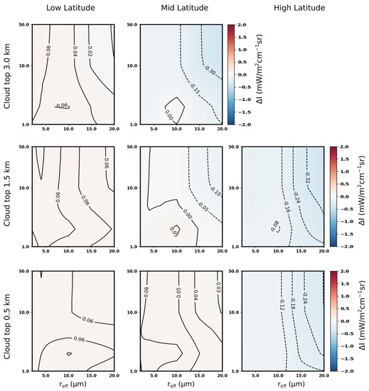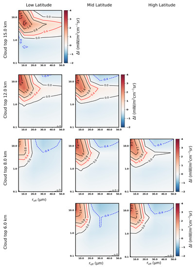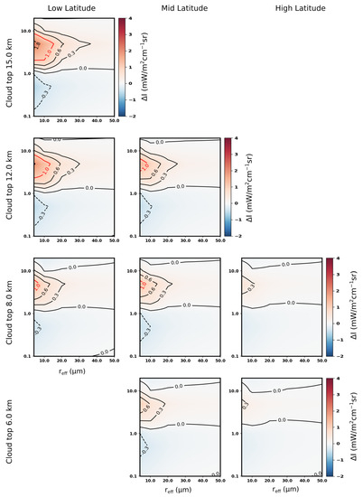 At FIR wavenumbers and in a tropical scenario (first column of Figure 5), the radiance differences are close to zero for all the studied cases also because of the attenuating effect of precipitable water vapor (PWV) above the cloud layers, which is related to the upper atmospheric layer transmissivity. The higher the PWV above the cloud top level, the smaller the radiance difference. This masking effect becomes particularly effective for PWV values larger than about 4 mm [33], and it is the reason why radiance differences (slightly) increase with the increasing cloud top for a fixed latitude, as well as with increasing latitude for fixed cloud top height.