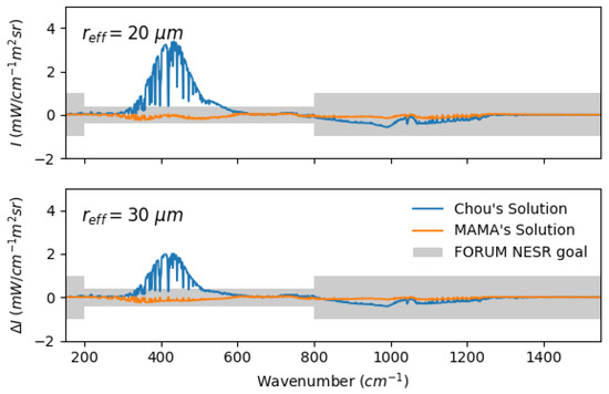 The spectral radiance differences between simulations obtained using the MAMA methodology and the reference algorithm (DISORT) are evaluated also in the presence of ice clouds. Figure 6 illustrates a result for a full spectrum, where the top of the atmosphere radiance differences are plotted for a mid-latitude cirrus cloud (top altitude placed at 8 km) and for two different effective radii ( and m). The cloud OD is set to unity so that the multiple-scattering effects are maximized [37] and the quality of the scaling method can be tested in challenging configurations. The results show the excellent level of agreement of the MAMA approach with the reference solution over the entire spectral range considered. Specifically, the MAMA code performs significantly better than the Chou scaling method in reproducing the spectral radiance at FIR wavenumbers, where scattering effects are amplified by the minimum in ice absorption (with maximum effect at around 410 ).