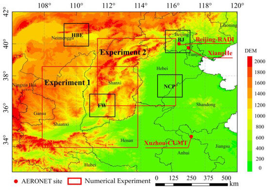 The study area in the north of China. HBE: Hu-Bao-E urban agglomeration, BJ: Beijing area, FW: Fenwei Basin, NCP: a flat area of the North China Plain. Experiment 1 and Experiment 2 were numerical experimentation areas.