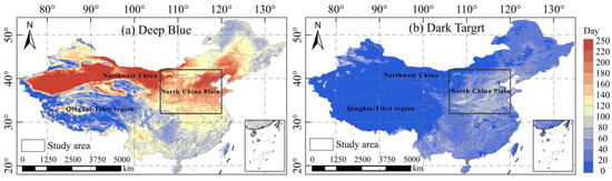 The DT algorithm screens the “dark pixel” targets with low surface reflectance and obtains the AOD by comparing the reflectance in the visible and near-infrared bands using the band ratio method [14]. The DB algorithm utilizes multi-band data, including the blue band that is sensitive to aerosol scattering and absorption, and applies inversion models to derive the results [40]. Figure 2 displays the number of the valid data days of the DT and DB in 2016. Since the DT AOD algorithm is mainly used in densely vegetated areas, the availability of a suitable time is limited. Coupled with cloud coverage, Figure 2a shows that the number of valid data days was less than the 100 in most areas and close to zero in the Tibet Plateau, Gobi, and desert regions of northwest China. In contrast, the DB AOD is useful for bright surfaces, and the valid data frequency was greater than 250 days in the northwest (Figure 2b). It was close to 200 days in the North China Plain, while due to the increasing cloud coverage moving southward, the frequency gradually reduced to less than 100 days.