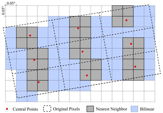 After the above processing, the resampling results with a 0.05° resolution were obtained. When the field-of-view angle was small, most of the pixels were sampled using the nearest neighbor method, while bilinear interpolation was used only in the positions far from the center of the pixel with a large-field-of view angle.