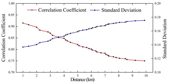 Figure 5 depicts the relationship between the correlation coefficient and the distance, the average result obtained from calculating the correlation between all pairs of points within the study area in the 2016, and the distance represents the distance between the central pixel and the outermost pixel. These show that the correlation coefficient gradually decreased as the distance increased, while the standard deviation increased. Considering both the correlation and its stability, we assumed that a correlation coefficient of 0.8 was suitable for interpolation, the interpolated range was 60 km, and the standard deviation was approximately 0.15.