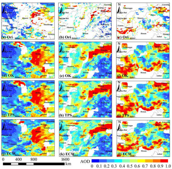 Interpolation results for three examples 18 May, 10 August, and 22 August 2016. The first row (a–c) is the raw AOD data after resampling, and the other rows are the AOD interpolation results using the OK, TPS, and ECW methods. (d–l) are different interpolation results in three examples.