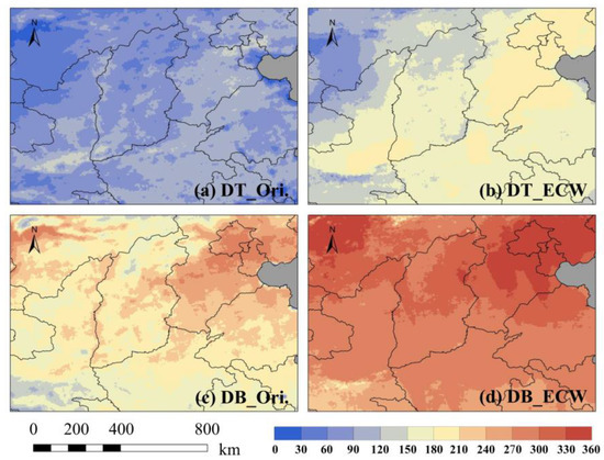 Second, with limited observational data, the ECW method increased the spatial coverage and the number of effective days. The DT and DB product achieved a time coverage of nearly 150 and 300 days, respectively.