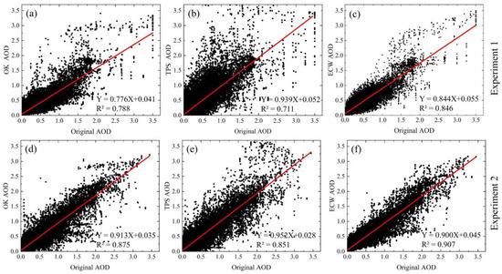 In order to avoid the effect that the bias of a small amount of data has on the mean value, we validated all the interpolated results of the two numerical experiments. The scatter diagrams (Figure 12) between the interpolated results and the original values in the artificially eliminated areas demonstrate the advantages of the ECW method. TPS interpolation acquired the lowest R2 of 0.711 and 0.851 in both experiments. The R2 values for the ECW were 0.846 in Experiment 1 and 0.907 in Experiment 2. Compared with the other two methods, the ECW performed well in interpolation accuracy. In particular, in Experiment 1, the overestimation of the ECW was more pronounced at high values of AOD (>2.0), while the OK and the TPS also showed more pronounced overestimation at low values.