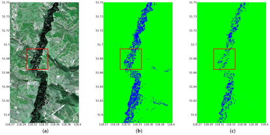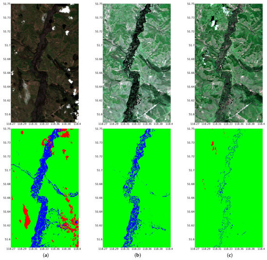 Demonstration of flood monitoring in Ushmun with series of images: RGB image and predicted mask on 4 June 2021 (a), estimated water surface area—81.3 km2, RGB image and predicted mask on 6 June 2021; (b) estimated water surface area—51.0 km2, RGB image and predicted mask on 11 June 2021; (c) estimated water surface area—8.9 km2. Legend: water, background, clouds.